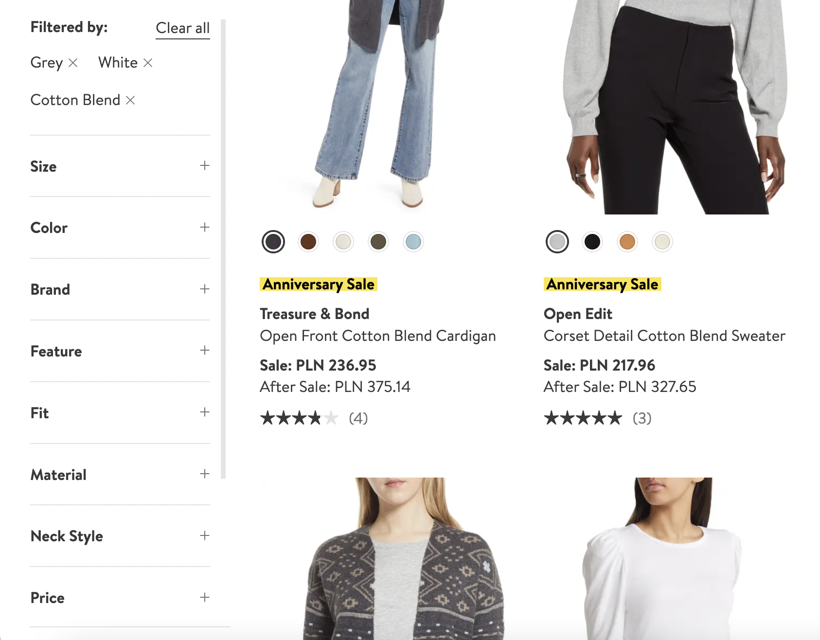 Dobrze, jeśli też filtry są specyficzne dla kategorii, czyli oprócz typowych filtrów dotyczących wszystkich produktów (cena, ocena, czas dostawy), była dostępna opcja filtrowania na podstawie cech szczególnych, jak np. wysokość obcasa w kategorii obuwie, czy długość rękawa w bluzkach.