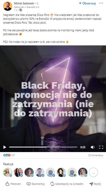 Sposobów na zachęcenie klientów do skorzystania z promocji na Black Friday jest wiele. W przygotowywaniu kampanii marketingowych ponad wszystko liczy się więc kreatywność. Tej z pewnością nie brakuje Michałowi Sadowskiemu z Brand24.