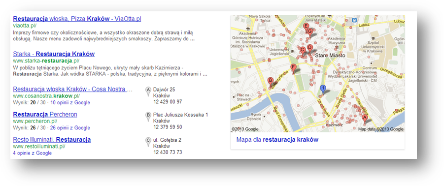 Ostatnim elementem, na który warto zwrócić uwagę przed rozpoczęciem współpracy są tzw. Wyniki map. Zazwyczaj w zapytaniach do wyszukiwarki zawierających lokalizację, Google pokazuje kilka wyników z map Google (pokazane poniżej). Powinniśmy ustalić z agencją czy wyniki map mają być uwzględniane w rozliczeniu.