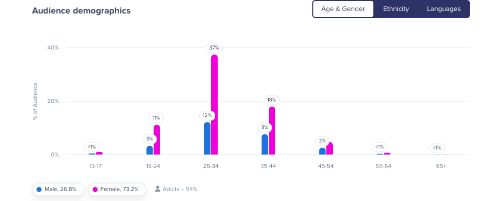 Ważne są informacje dotyczące rozkładu płci odbiorców, ich wieku, dominujących lokalizacji (kraj, miasta), języku. Na tej podstawie ustalisz, na ile grupa odbiorców influencera pokrywa się z tą, do której chcesz dotrzeć w kampanii.