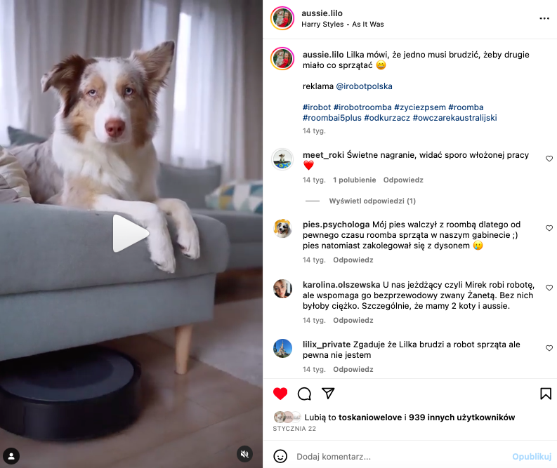 Dobrym przykładem może być lokowanie robota sprzątającego iRobot na profilu influencerki, która prowadzi profil o swoim psie. Lokowanie jest naturalne i odpowiada na problem, jaki rozwiązuje produkt: sprzątanie sierści po zwierzaku.