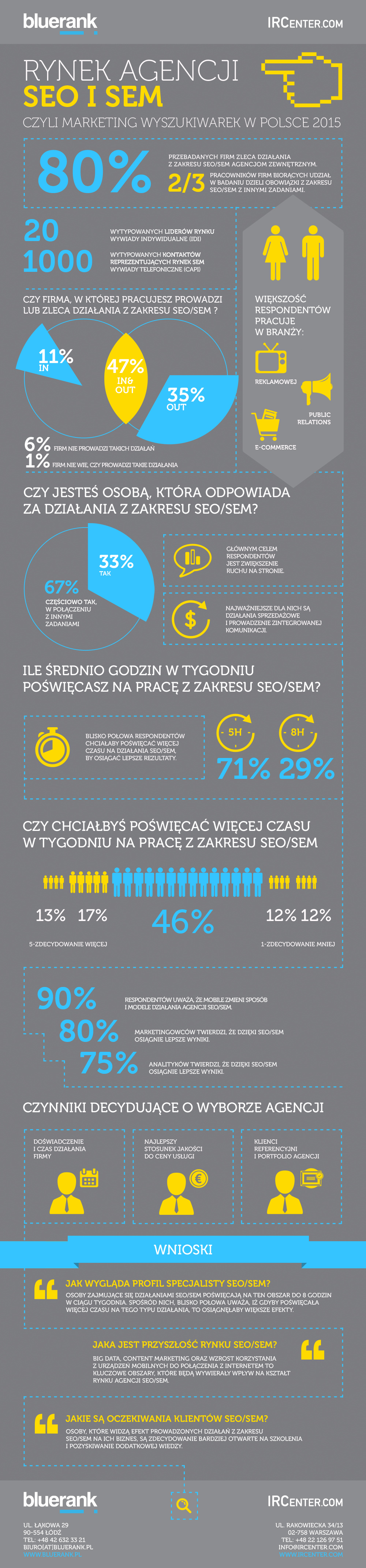 Aż 80% spośród przebadanych firm prowadzi działania z zakresu SEO/SEM korzystając z usług agencji zewnętrznych. 35% badanych zleca te działania całkowicie na zewnątrz, 11% wykonuje je wewnątrz firmy, z kolei 47% badanych realizuje je zarówno wewnątrz, jak i zleca zewnętrznym podwykonawcom.