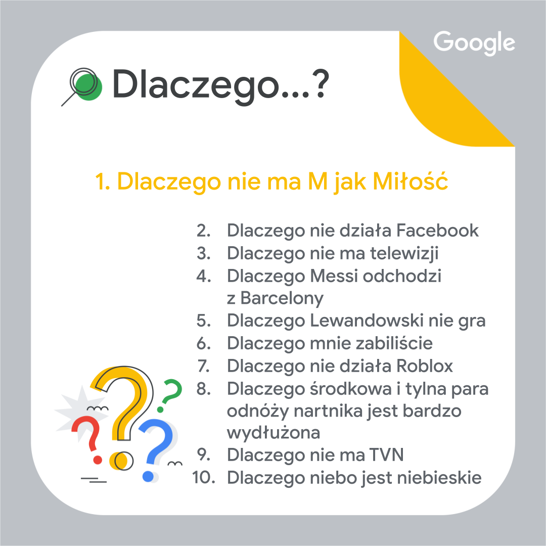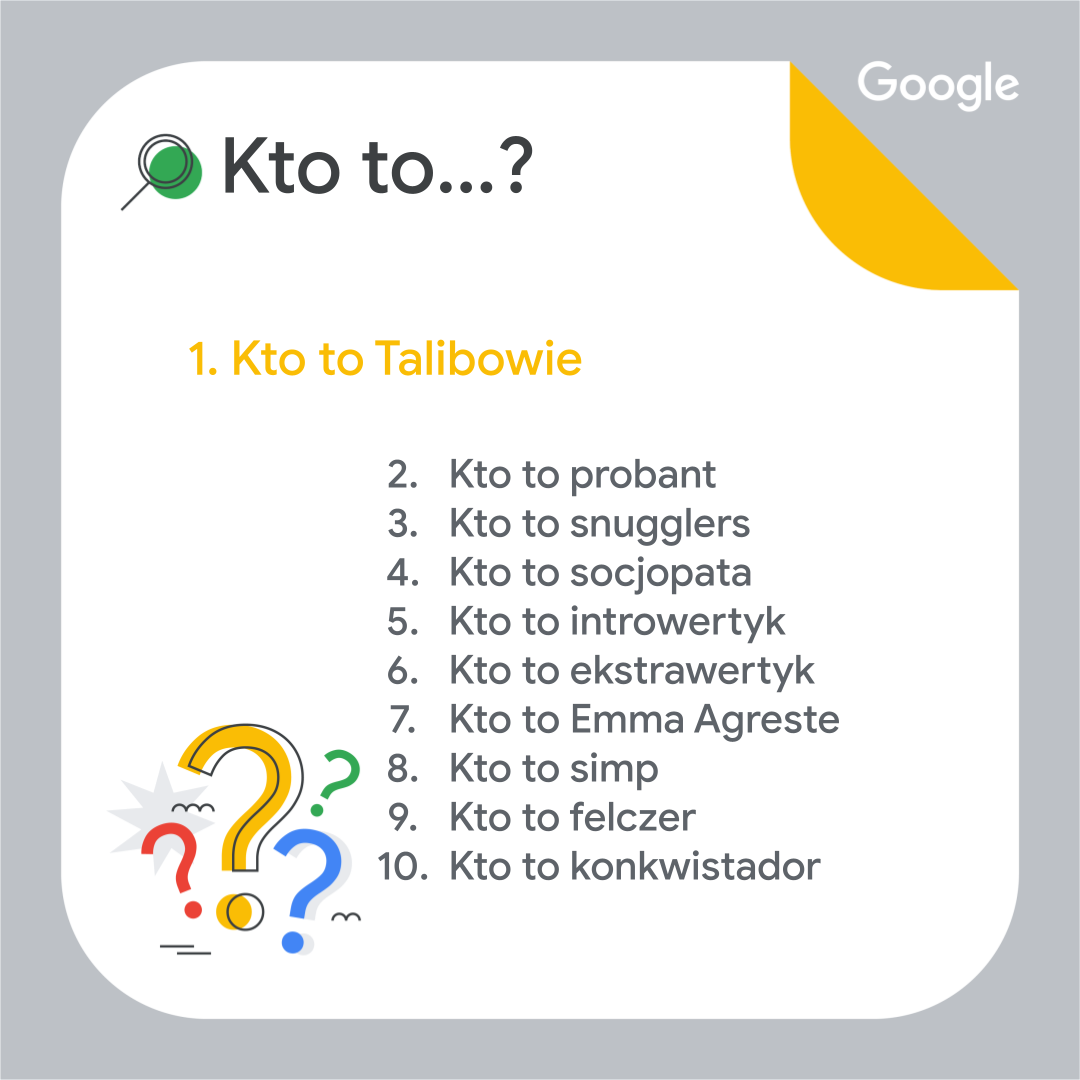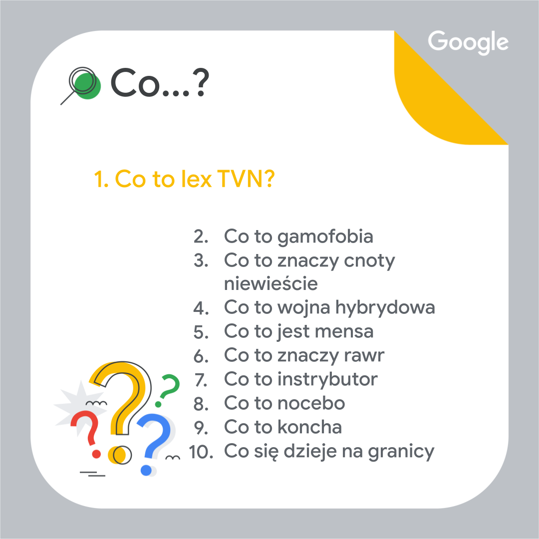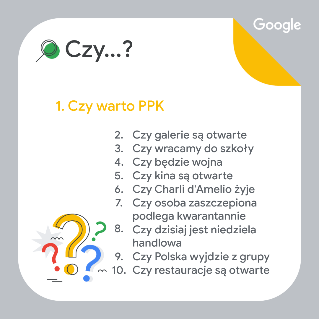 Internauci i internautki jak co roku zadawali wiele pytań. One również odzwierciedlały naszą rzeczywistość. Najpopularniejsze z nich w kategorii Jak…? dotyczyły pandemii: jak zapisać się na szczepienie (1. miejsce) czy jak pobrać paszport covidowy (5. miejsce na tej samej liście). Szukano także wyjaśnień: dlaczego nie ma telewizji (3. miejsce na liście Dlaczego…?), dlaczego nie ma TVN ( miejsce 9.). Zainteresowanie Afganistanem było widoczne w pytaniu kto to Talibowie? (1. miejsce na liście Kto to…?). Polacy sprawdzali też ile kosztuje test na covid, chleb czy bitcoin. Na fali popularności memów z cnotami niewieścimi, użytkowniczki i użytkownicy internetu pytali także: co to znaczy cnoty niewieście? (3. miejsce na liście Co…?).