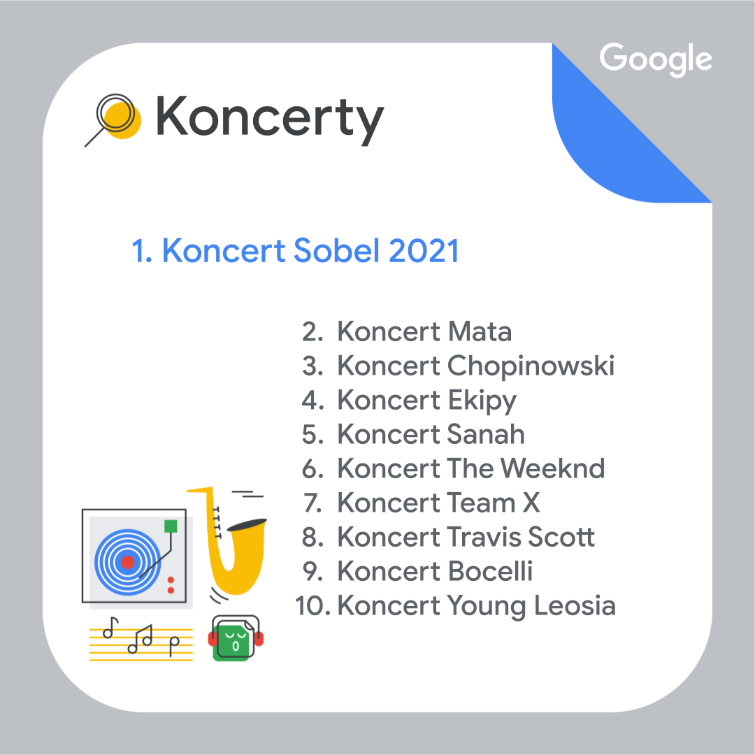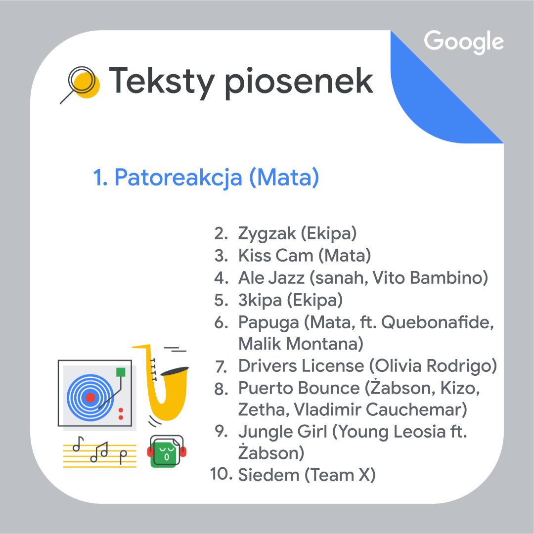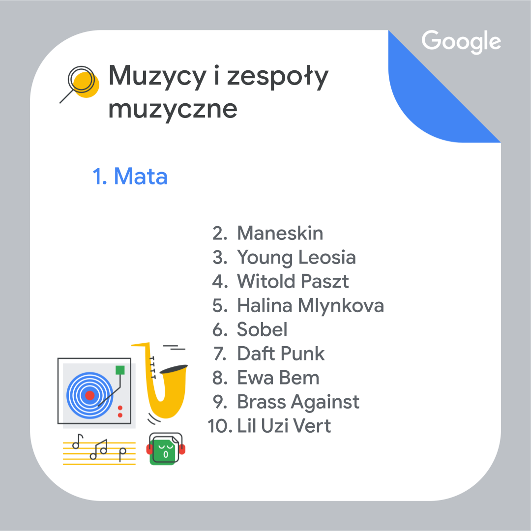 Ten rok obfitował również w interesujące wydarzenia muzyczne, pojawiło się także wiele nowych hitów. Największą popularnością w wyszukiwarce Google cieszył się raper Mata (1. miejsce na liście Muzycy i zespoły muzyczne), wysoko uplasowały się również jego utwory: tekst do Patoreakcji był najchętniej wyszukiwanym tekstem w mijającym roku, a na trzecim miejscu znalazł się tekst Kiss Cam. Tegoroczny koncert Maty na bemowskim stadionie znalazł się na drugim miejscu zestawienia Koncerty, ustępując jedynie miejsca koncertowi Sobla 2021 (1. miejsce).
