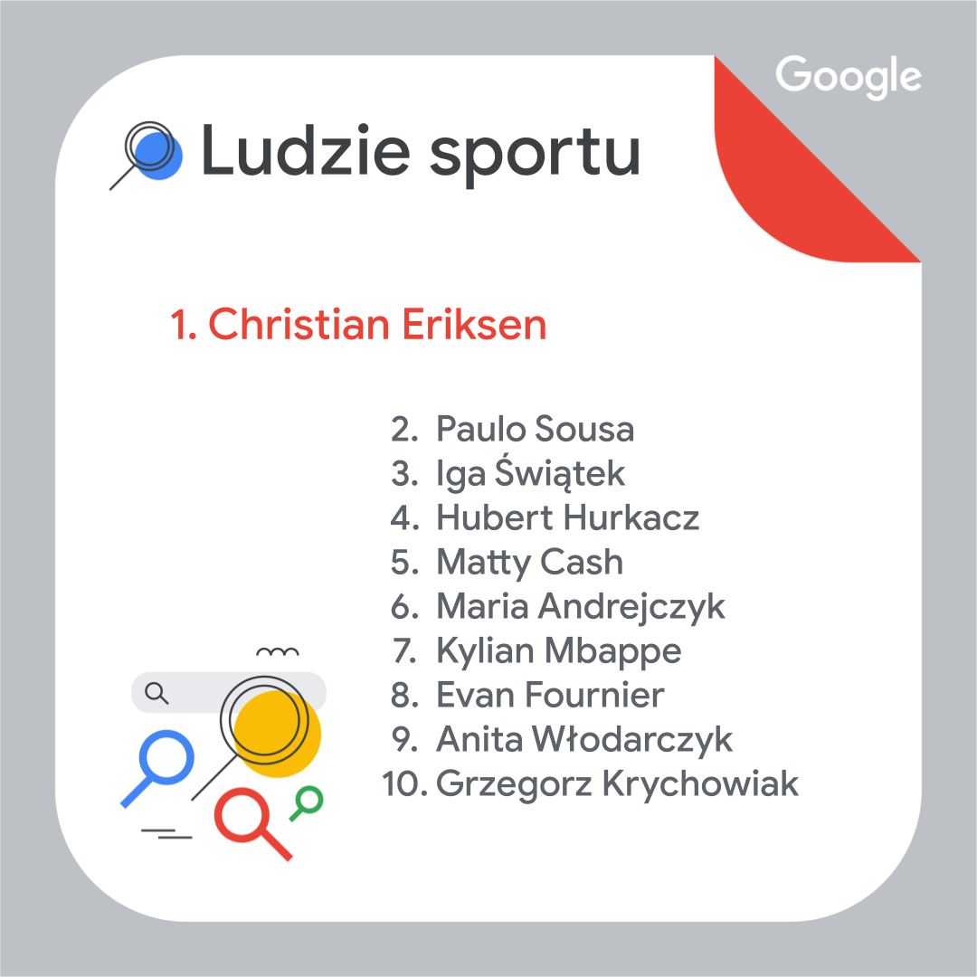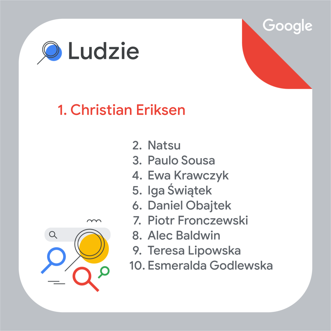 Jak zawsze, wśród wpisywanych w wyszukiwarkę haseł, znalazło się sporo nazwisk – wyszukiwano informacje zarówno o ludziach, którzy odeszli, jak i o tych, którzy zaistnieli z przeróżnych powodów w świadomości internautów. Na czele polskiej listy Ludzie pojawił się duński piłkarz Christian Eriksen. Zainteresowaniem cieszył się także trener reprezentacji Polski w piłce nożnej – Paulo Sousa (3. miejsce) czy tenisistka Iga Świątek (5. miejsce). Poza wymienioną wyżej trójką w zestawieniu znaleźć można między innymi Natsu (2. miejsce), Daniela Obajtka (6. miejsce) czy Piotra Fronczewskiego (7. miejsce). Niedawna tragedia na planie westernu „Rust” spowodowała, że amerykański aktor, Alec Baldwin, pojawił się na pierwszym miejscu globalnej listy Ludzie oraz na ósmym w Polsce.