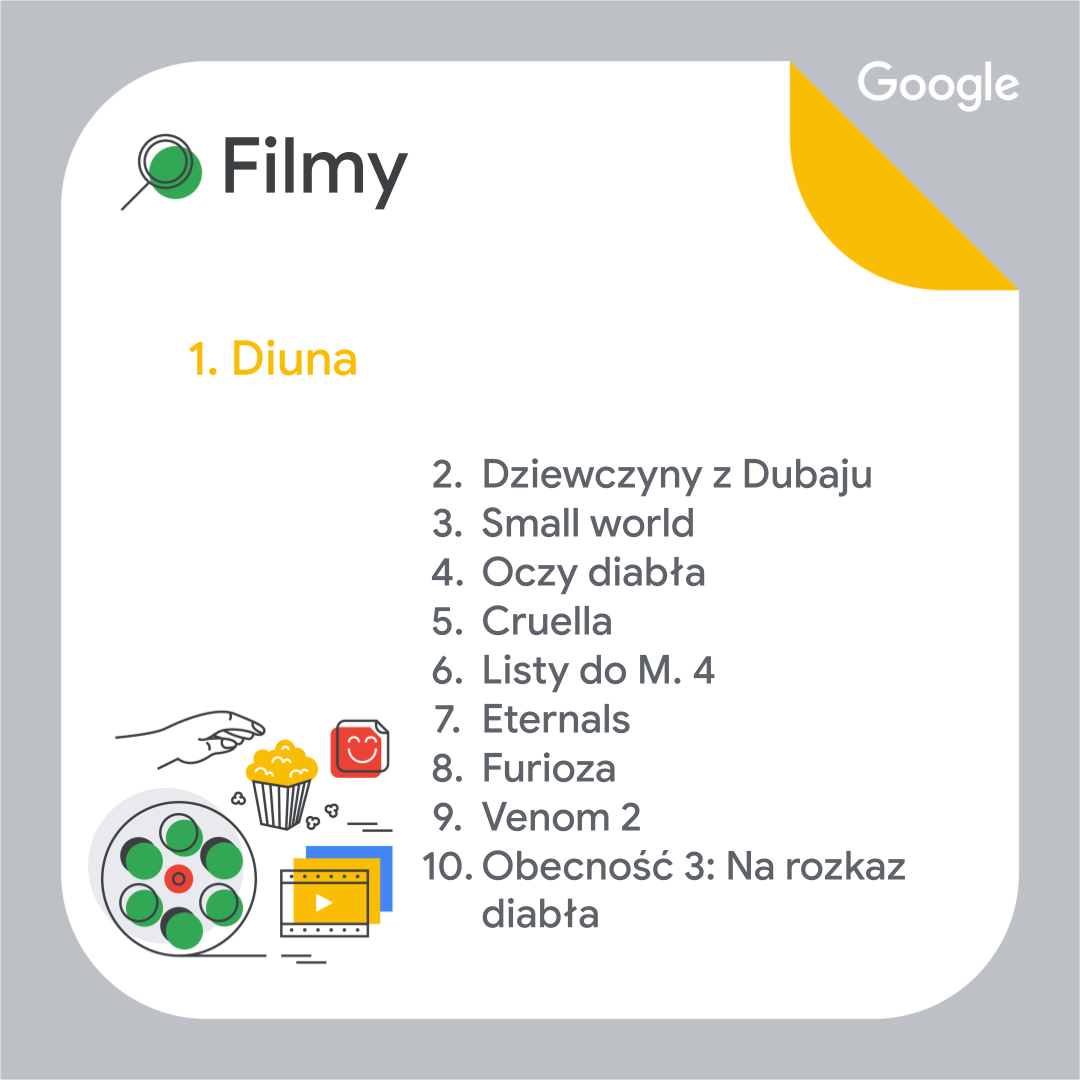 Jakie filmy i seriale zdobyły uwagę internautów? W Polsce na czele kategorii Filmy znalazła się długo wyczekiwana ekranizacja Diuny (3. miejsce na świecie). Spore zainteresowanie wzbudził również film Dziewczyny z Dubaju (2. miejsce). Popularna okazała się czwarta część serii Listy do M (6. miejsce), obrazy Patryka Vegi Small world (3. miejsce) i Oczy diabła (4. miejsce) czy film Furioza (8. miejsce). Wśród zagranicznych produkcji w TOP 10 znajdziemy filmy takie jak: Cruella, Eternals, Venom 2 czy Obecność 3. W globalnym zestawieniu nie zabrakło Czarnej Wdowy czy Czerwonej noty.