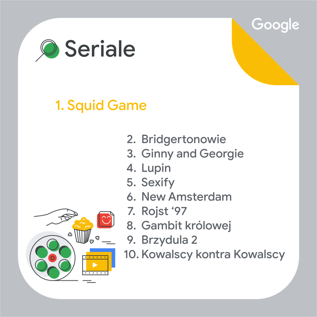 A jakie seriale interesowały Polaków i Polki? Zwycięzca to Squid Game. Koreański serial o grze podbił internet. Wiele emocji i zainteresowania wzbudził również serial Bridgertonowie (2. miejsce), Lupin (4. miejsce) czy New Amsterdam(6. miejsce). Wśród polskich seriali w zestawieniu prym wiodły: Sexify (5. miejsce), Rojst ’97 (7. miejsce). Dwa ostatnie miejsca to również krajowe produkcje: Brzydula 2 oraz Kowalscy kontra Kowalscy.