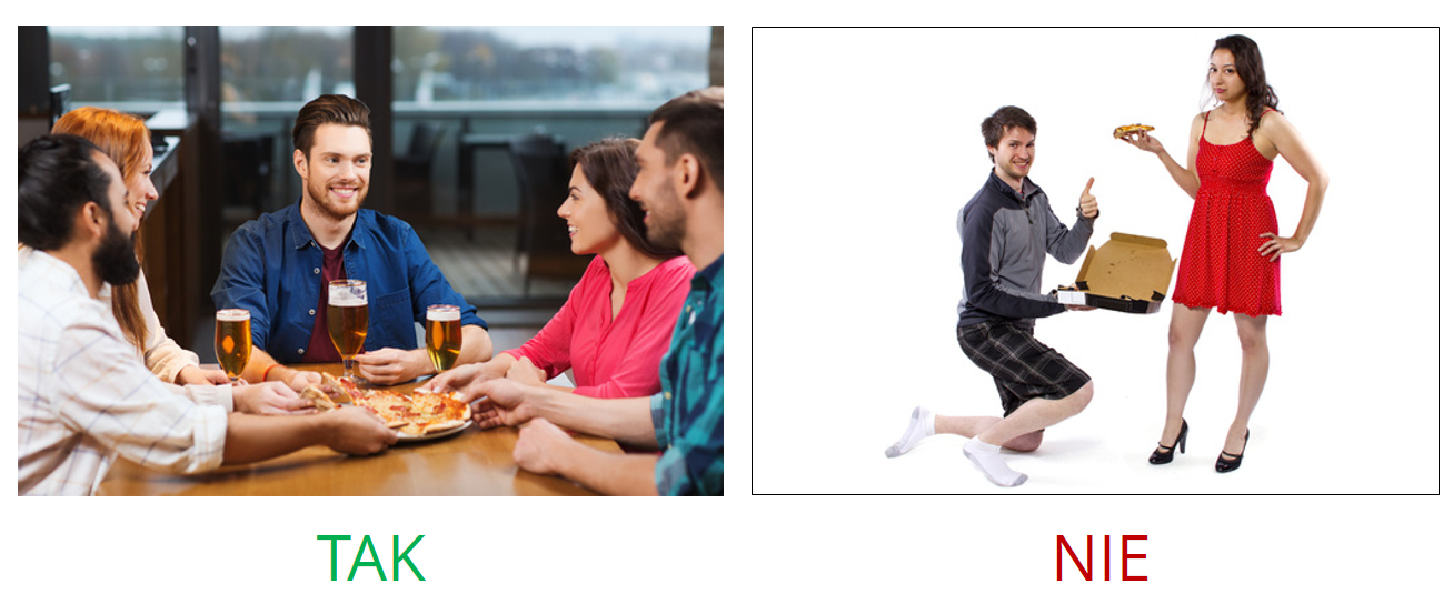 Oprócz dań warto czasem pokazać klimat restauracji – wnętrza albo „klientów” siedzących przy stole. Tutaj również można pomyśleć o sesji fotograficznej, jednak generuje to koszty związane z wynajęciem modeli, uzyskanie praw do wykorzystania wizerunku i cała organizację sesji z profesjonalnym fotografem. Można więc skorzystać z dostępnych baz zdjęć. Koszt zakupu jednego zdjęcia waha się od 5 do 20 zł, w zależności od banku zdjęć. Warto jednak zawsze na każde zdjęcie popatrzeć trzeźwym okiem i zastanowić się, czy wygląda naturalnie. W internecie krąży pełno zdjęć z tzw. stocków, które wyglądają nienaturalnie i ich zła sława urosła już niemalże do rangi memów.