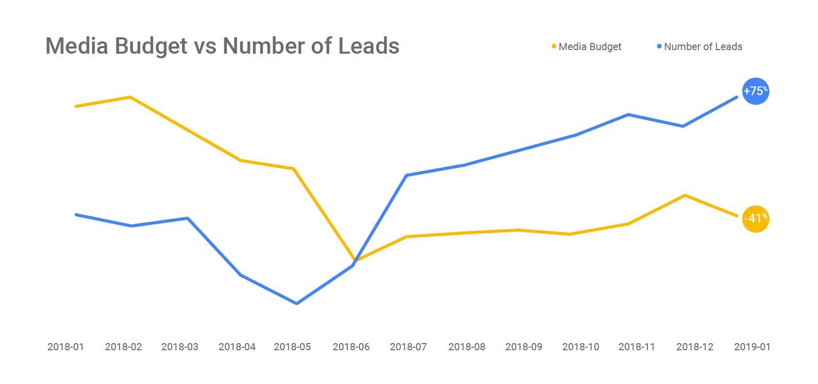 Uruchomienie nowej struktury w czerwcu 2018 r. zaowocowało wzrostem liczby potencjalnych klientów o 86% w drugiej połowie roku przy jednoczesnym zmniejszeniu budżetu na zbieranie zamówień o 33%. Skuteczność wzrosła, ponieważ zespół kontynuował optymalizację kampanii.