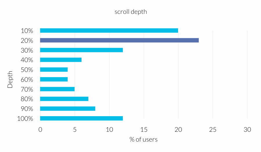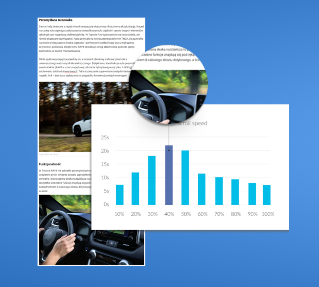 Niemniej badanie scrollowania ewoluowało właśnie z analiz map ciepła. Obecnie, dzięki lepszym narzędziom, można tworzyć użyteczne wskaźniki analityczne. – Jednym z nich jest głębokość scrollowania, wskazująca poziom strony, do którego dotarł czytelnik. Z kolei prędkość scrollowania pokazuje dynamikę korzystania ze strony. Można ją wyrazić w różny sposób, na przykład licząc liczbę przesuniętych pikseli w ciągu sekundy lub procent czasu spędzonego na każdej głębokości – tłumaczy Tomasz Wileński.