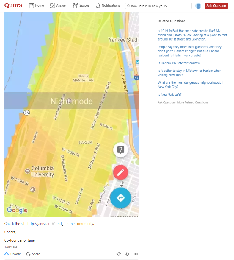 Założyciele firmy Jane Safety Map – aplikacji mobilnej, która pozwala użytkownikom dzielić się poczuciem bezpieczeństwa, odpowiadali na pytania dotyczące bezpieczeństwa w dużych miastach tj. San Francisco, Los Angeles, Boston itd. poprzez zamieszczanie screena z aplikacji prezentującej poziom bezpieczeństwa i zachęcającej do dołączenia do społeczności Jane.