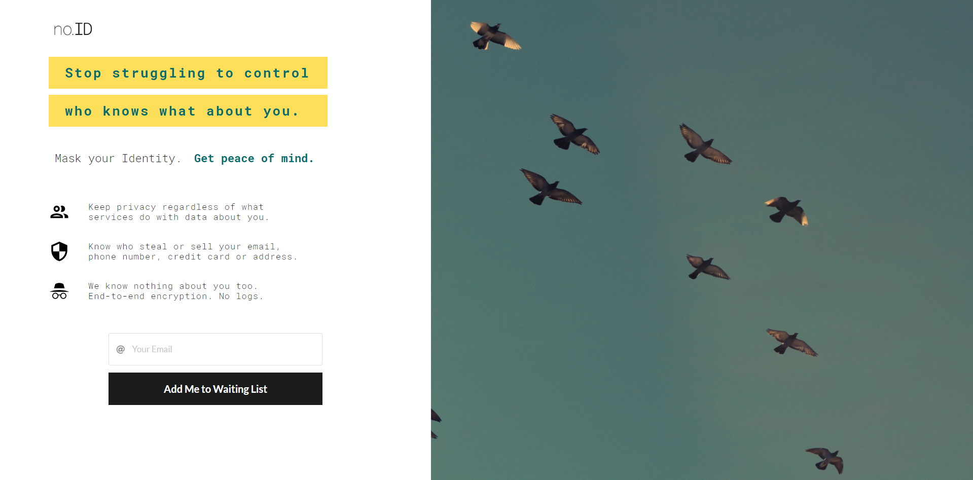 Ciekawym przykładem minimalistycznego landing page’a jest noid.today. Założyciele postawili sobie za cel stworzyć usługę, która pozwala być anonimowym w sieci – sprawiają, że firmy nie wiedzą kim jesteś, jaki masz numer telefonu, gdzie mieszkasz i jakie masz dane karty płatniczej. Dzięki temu nie musisz się martwić kto ma twoje dane osobowe i co z nimi robi. Niezwykłe jest to, że strona noid.today nie ma nawet podpiętej standardowej analityki śledzącej, co oznacza, że Google, Facebook czy inne firmy, które profilują ciebie w Internecie, nie wiedzą, że byłeś na tej stronie i jesteś zainteresowany usługą. Zbierają tylko dane statystyczne tj. ile było wejść na stronę, w jaki guzik ile razy kliknięto, bez rejestracji adresu ID użytkownika, czy profilowaniu go po tym co robił na stronie.