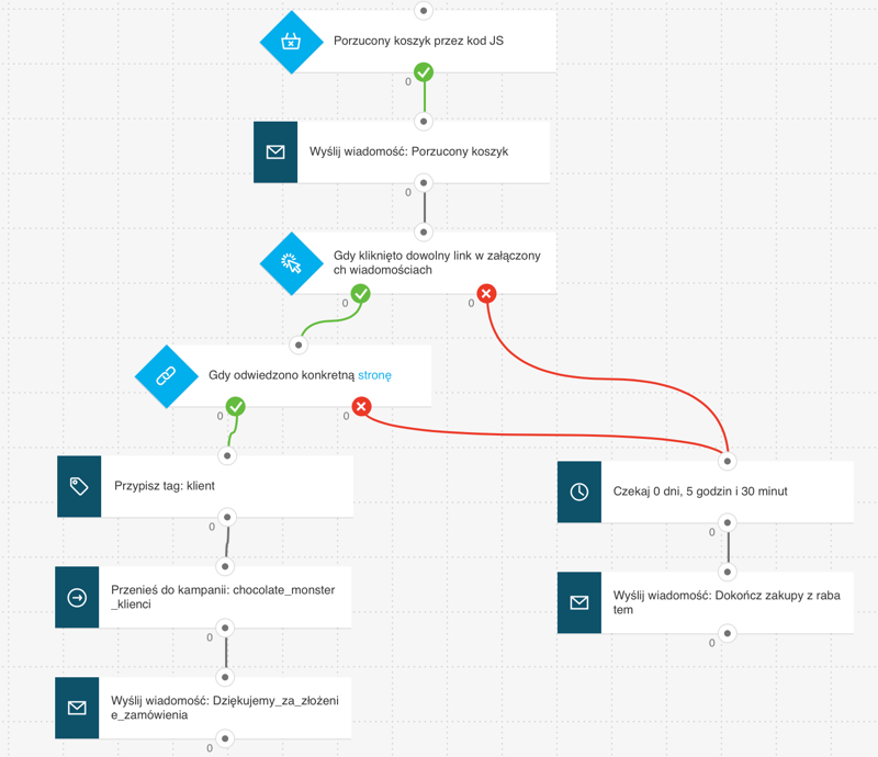 Przykładowy cykl marketing automation wykorzystujący akcję „przypisz tag”