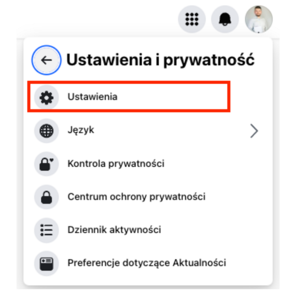 • w prawym górnym rogu kliknij zdjęcie profilowe -> „Ustawienia i prywatność” -> „Ustawienia”,