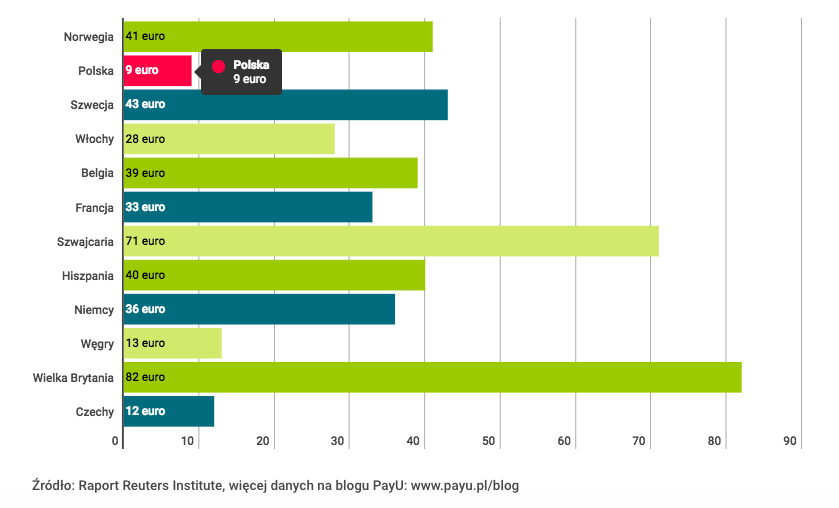 Raport Reutersa mówi już o faktycznych zachowaniach Polaków. 1/4 z nich zapłaciła w 2016 r. za jakąś treść i średnio było to 9 euro – jednorazowo, nie regularnie. To najmniej ze wszystkich badanych przez Reutersa krajów. Mniej niż płacą Czesi.