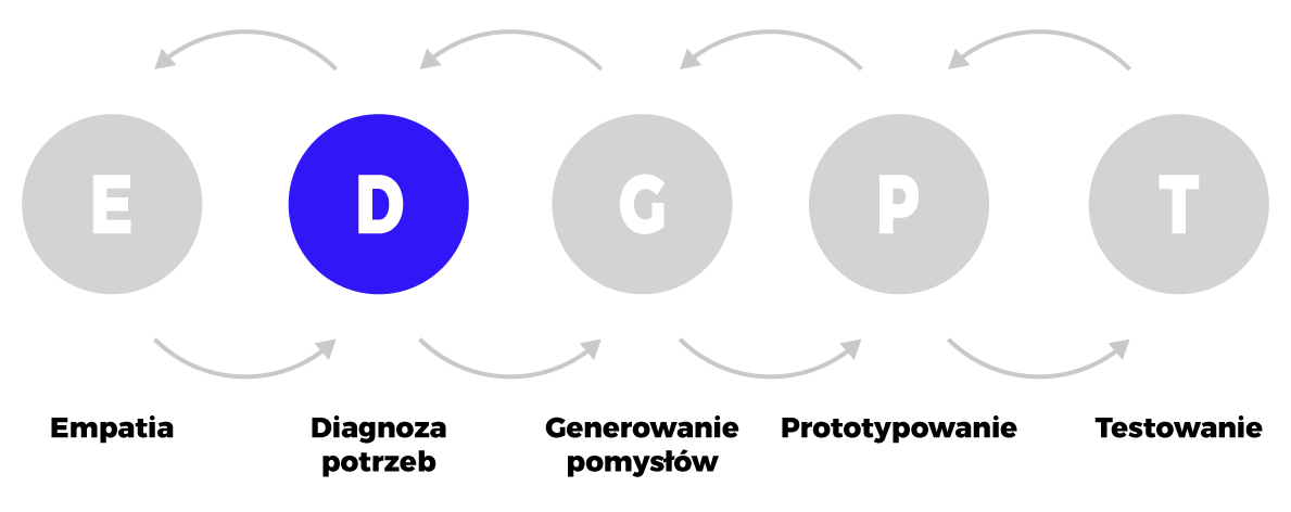 Tylko prawidłowo zdefiniowany problem może doprowadzić do znalezienia odpowiedniego rozwiązania. Jeśli zespół ma wątpliwości dotyczące swojej diagnozy, lepiej cofnąć się do etapu empatii i dopytać użytkowników o niewyjaśnione wcześniej kwestie, niż tracić czas na dalsze etapy procesu bez 100% pewności, że zespół dobrze rozumie problem, z którym się mierzy, a wyzwanie projektowe jest dobrze zdefiniowane. Wszak Design Thinking to metoda iteracyjna i warto korzystać z możliwości powrotu do poprzedniego etapu podczas całego procesu.