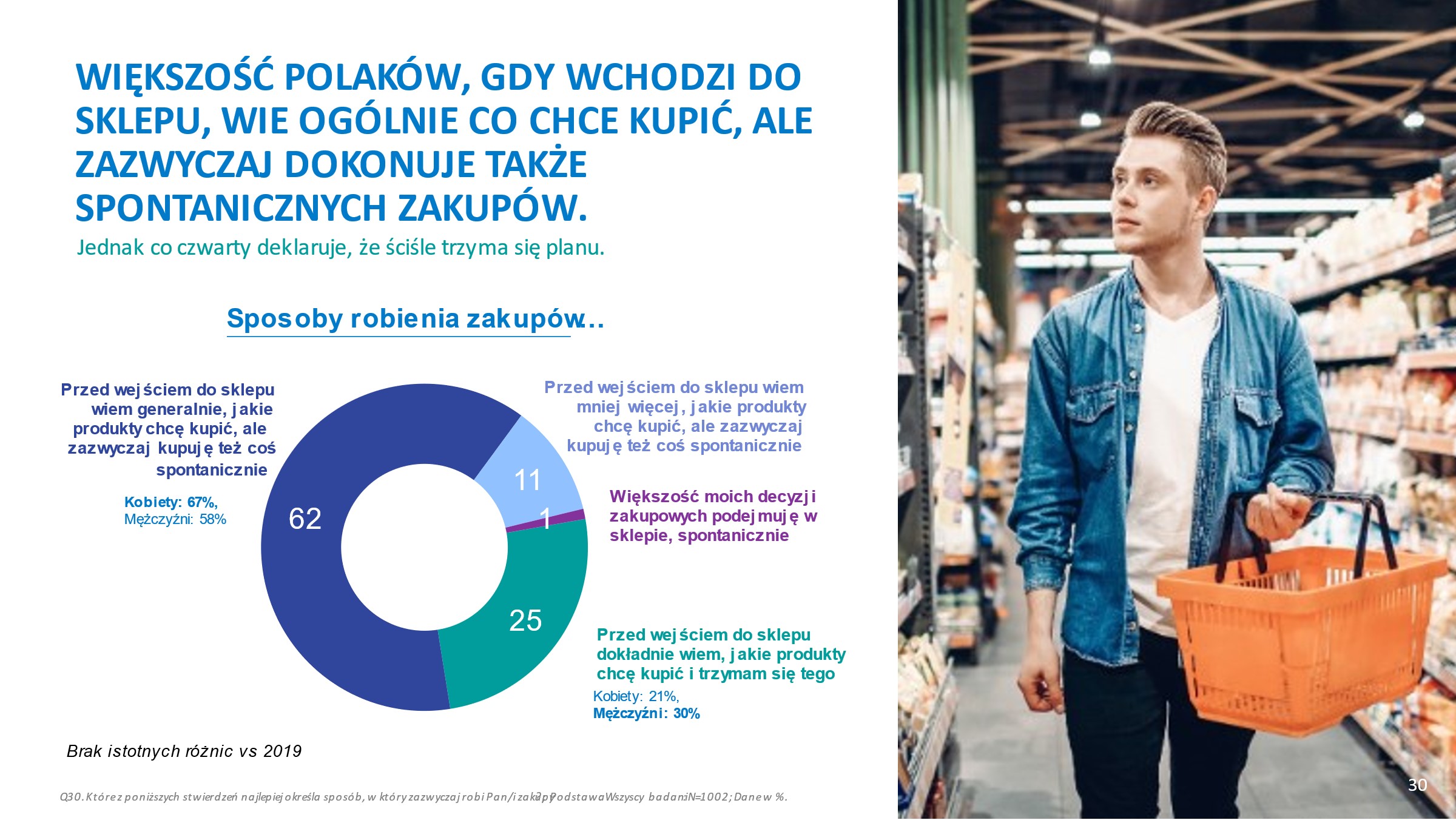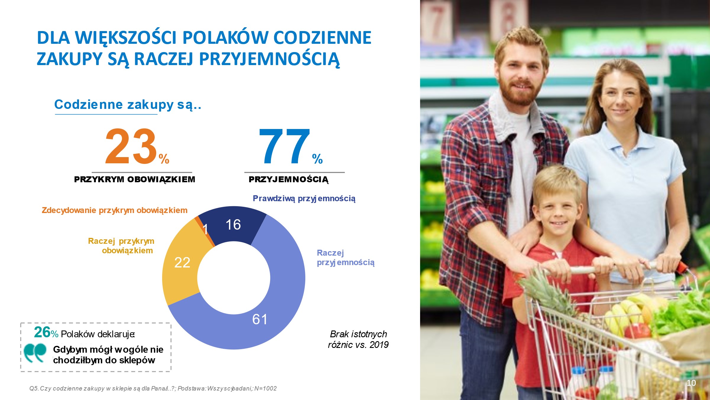 Czy dla Polaków zakupy są raczej przyjemnością czy przykrym obowiązkiem? Dla aż 77% Polaków zakupy zdecydowanie są przyjemnością, z kolei 23% postrzega zakupy jako przykry obowiązek. Co więcej, nie ma tu istotnych różnic w zachowaniu konsumentów w stosunku do 2019 roku. „Dobra wiadomość jest taka, że jeśli lubimy coś robić, to jesteśmy skłonni poświęcić tej czynności trochę więcej czasu czy ewentualnie zainteresować się czymś wcześniej niezaplanowanym, a w przypadku zakupów jest to np. uleganie pokusie promocji” mówi Mateusz Głowacki, Dyrektor Badań Ilościowych Ipsos Polska. Ciągle najbardziej dominującym zjawiskiem jest to, że raz w tygodniu robimy duże zakupy, w czasie których kupujemy produkty również na zapas, ewentualnie braki uzupełniając małymi zakupami – tak zachowuje się aż 74% Polaków.