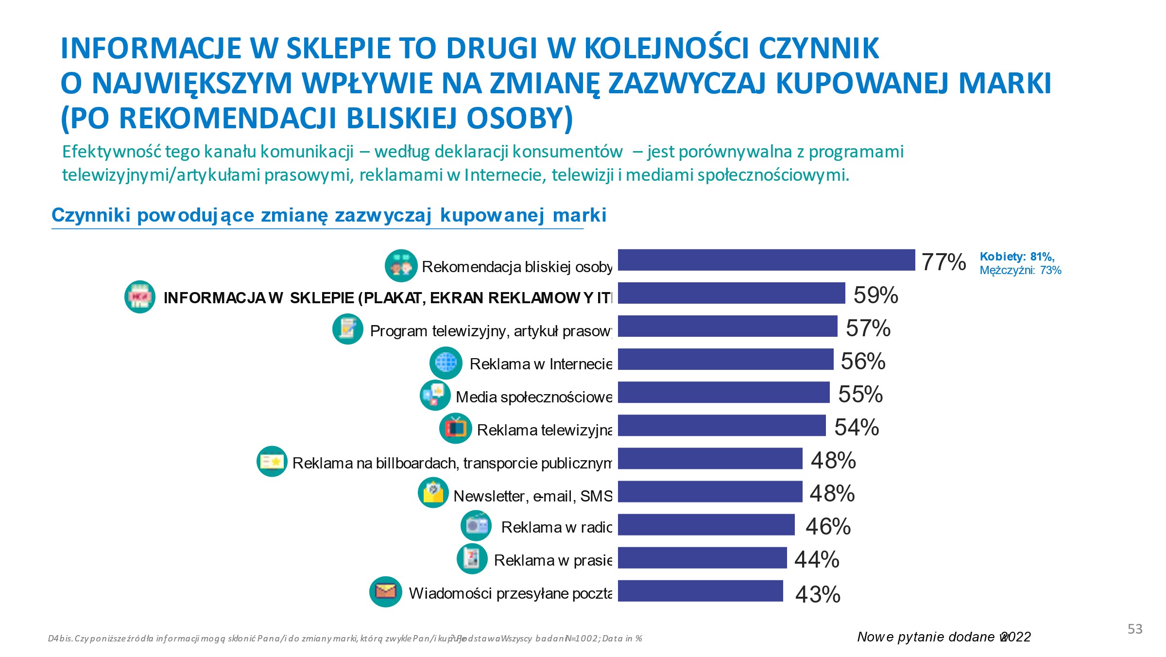 Shopper zachowuje się inaczej w poszczególnych kategoriach zakupowych – mówi Bartosz Domaradzki, in-Store Media Polska.  Aż 59% Polaków mówi o tym, że czynnikiem, który wpływa na zmianę zazwyczaj kupowanej marki, jest informacja w sklepie (plakat, ekran reklamowy. To drugi w kolejności czynnik po rekomendacji kupowanej marki przez bliską osobę (77%). Efektywność tego kanału komunikacji – według deklaracji konsumentów – jest porównywalna z programami telewizyjnymi/artykułami prasowymi, reklamami w Internecie, telewizji i mediami społecznościowymi. Zrozumienie, jak zachowujemy się w każdej kategorii, pomaga nam przyciągnąć kupujących do naszej półki i sprawić, by wybrali naszą markę – dodaje Domaradzki.