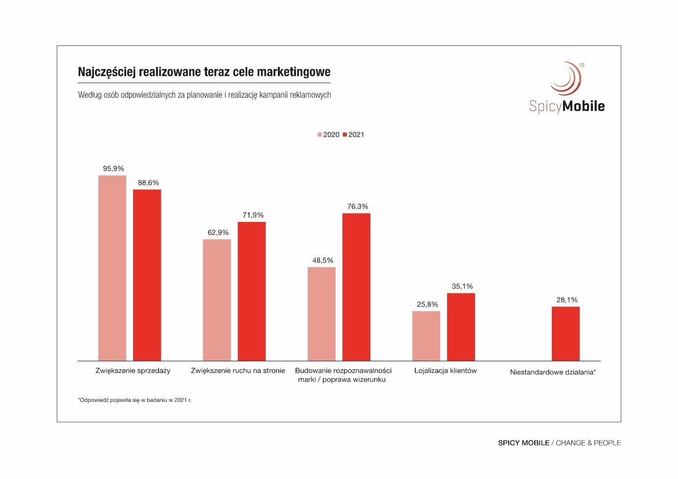 Jakie cele marketingowe realizują reklamodawcy? W 2020 r., po pierwszym lockdownie, marketerzy stawiali głównie na cele mierzalne, efektywnościowe. Do najczęściej realizowanych celów marketingowych należało zwiększenie sprzedaży (95,9% wskazań), zwiększenie ruchu na stronie (62,9%) oraz pozyskiwanie leadów (61,9%). Mniej niż połowa ankietowanych wymieniła cele wizerunkowe, jeszcze mniej budowanie relacji z obecnymi klientami (25,8%).