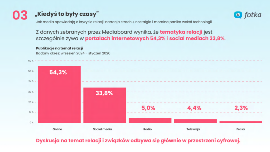 Raport „25 lat relacji w internecie” zrealizowany przez mediaboard i portal Fotka.pl analizuje, jak na przestrzeni ostatniego ćwierćwiecza zmieniły się sposoby budowania i podtrzymywania relacji online. Od czasów forów internetowych i komunikatorów, przez erę mediów społecznościowych, aż po współczesne platformy oparte na algorytmach – internet stał się jednym z głównych środowisk tworzenia więzi międzyludzkich.