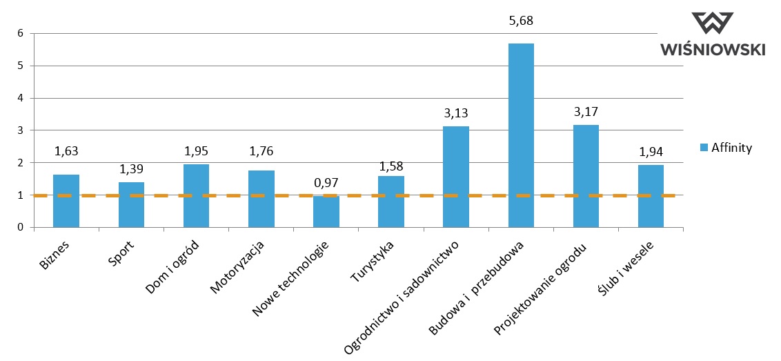 Przykład: spójrzmy na dane z raportu przygotowanego dla serwisu Wisniowski.pl, producenta bram i ogrodzeń, zarówno mieszkaniowych, jak i przemysłowych. Jak widać, pewne kategorie zainteresowań użytkowników serwisu, jak „Budowa i przebudowa” czy „Projektowanie ogrodu”, są oczywiste, jednak już większe zainteresowanie kategorią „Ślub i wesele” nie jest czymś, co łatwo wydedukować. Oczywiście, post factum jesteśmy w stanie zbudować teorię, która wyjaśnia to zjawisko (np. możemy domniemywać, że ślub jest często okazją do przeprowadzki do nowego domu, co może się wiązać z koniecznością zakupu bramy lub ogrodzenia), jednak trudno oczekiwać, że ktokolwiek na taki związek wpadnie a priori.
