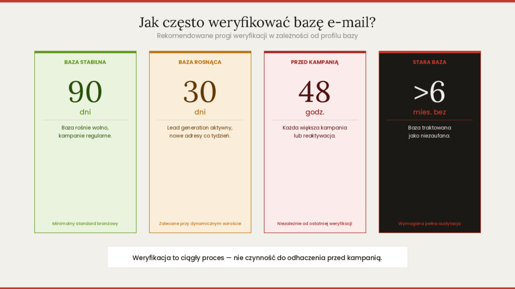 Częstotliwość weryfikacji zależy od dynamiki wzrostu bazy i intensywności kampanii. Nie ma jednej odpowiedzi – są progi, które warto znać.