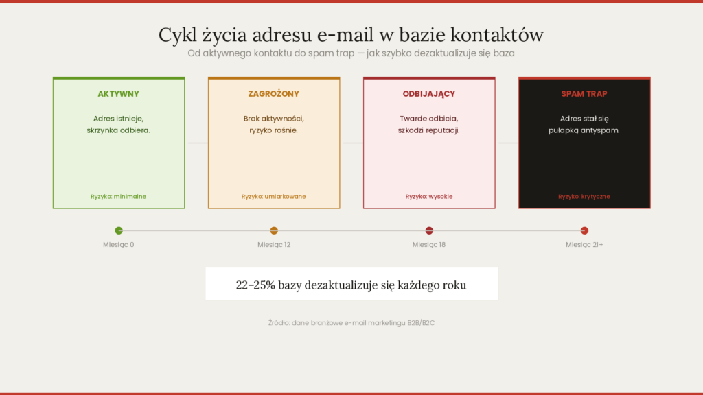 Dane kontaktowe psują się szybciej, niż większość marketerów zakłada. To nie teoria – to liczba widoczna w każdym raporcie o bounce rate.