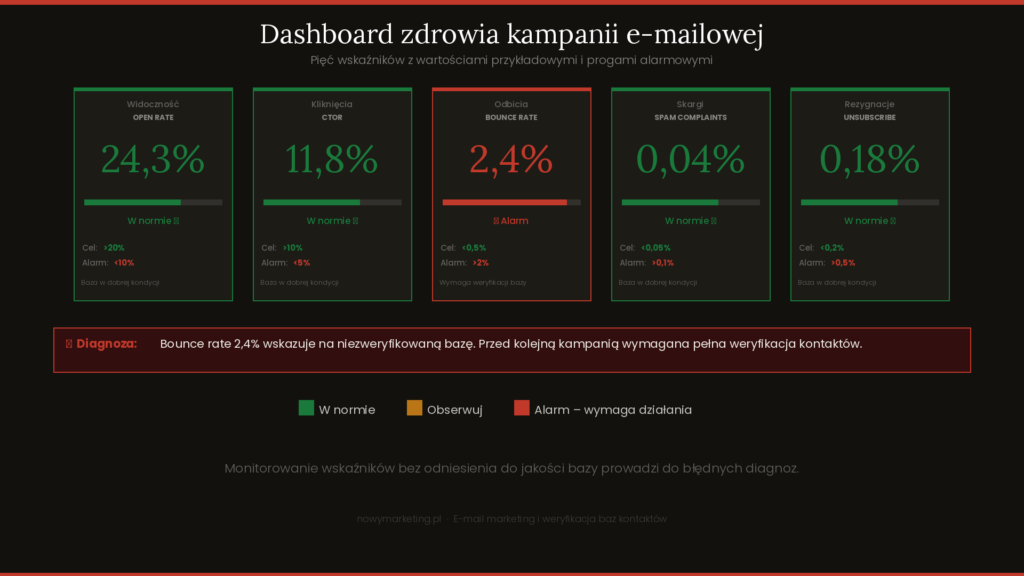 Bounce rate powyżej 2% jest sygnałem alarmowym dla dostawców skrzynek. Spam complaint rate powyżej 0,1% może skutkować tymczasową blokadą IP lub domeny. Oba wskaźniki zależą od jakości bazy – nie od treści wiadomości.