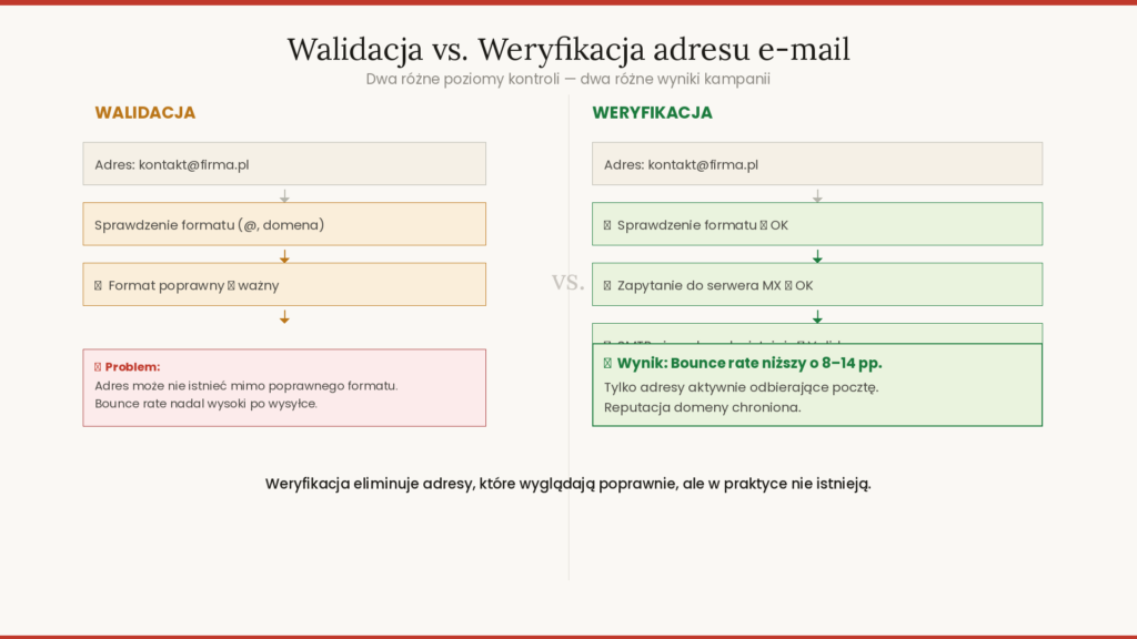 Walidacja sprawdza, czy adres jest poprawnie sformatowany – obecność @, właściwa struktura domeny. Weryfikacja idzie znacznie dalej: odpytuje serwer MX, sprawdza czy skrzynka istnieje i faktycznie przyjmuje wiadomości.