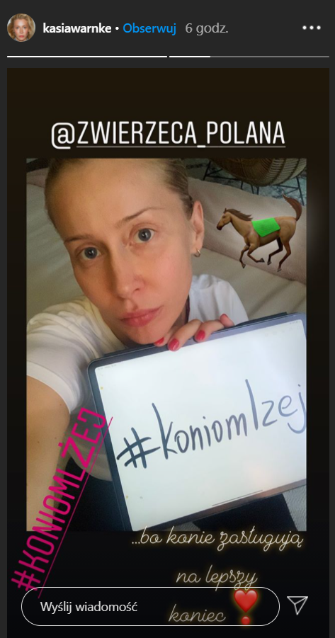 – Konie obecne są w naszej kulturze, życiu oraz piosenkach – towarzyszą, leczą ludzi, są obiektami ich wyobraźni. Mało kto zdaje sobie jednak sprawę z tego, że w Polsce około 30 tysięcy koni rocznie, w tym także źrebięta, kończy swoje życie w sposób okrutny, w cierpieniu. Zestawienia ujęć mają budzić emocje, skłaniać do myślenia oraz wywoływać sprzeciw. Chcemy pokazać, że los mordowanych zwierząt to sprawa nas wszystkich. Każdy może też pomóc, udostępnianiając spot z hashtagiem oraz wpłacając na budowę azylu – tłumaczy Aleksandra Grynczewska fundator i prezes zarządu Fundacji Zwierzęca Polana.