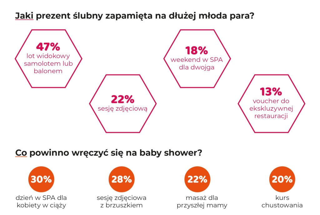 Autorzy badania zadali ankietowanym również pytanie o to, jakie upominki wybraliby na określone okazje. Pod uwagę wzięto m.in. wieczór panieński/kawalerski, czy baby shower. Wyniki pokazują, że potencjalni Panowie Młodzi ucieszyliby się z udziału w kursie przetrwania (21%) oraz tzw. ludzkiej procy (39%). Z okazji baby shower najczęściej wskazywano się na wieczór w SPA dla kobiety w ciąży.