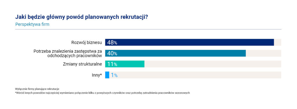 O większej ostrożności firm świadczą również odpowiedzi na pytanie o główny powód zaplanowanych rekrutacji. Zdaniem pracodawców rekrutacje rzadziej niż przed rokiem będą podyktowane rozwojem biznesu (48 proc.), a częściej koniecznością znalezienia zastępstwa dla pracowników, którzy zdecydują się odejść (40 proc.).