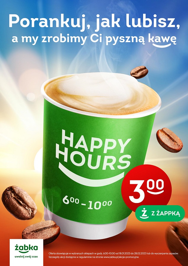 Kampania potrwa 6 tygodni – rozpoczęła się 18 stycznia br. i zgodnie z hasłem przewodnim obowiązuje rano, w godz. od 6:00 do 10:00. Dzięki ofercie każdy użytkownik Żappki ma możliwość umilenia swojego poranka nie tylko kawą (espresso, kawa czarna, kawa z mlekiem, latte, cappuccino), ale także dowolnym gorącym napojem (herbata, czekolada) w cenie 3 zł za kubek o pojemności do 200 ml. Promocja obowiązuje także w autonomicznych sklepach Żabka Nano.