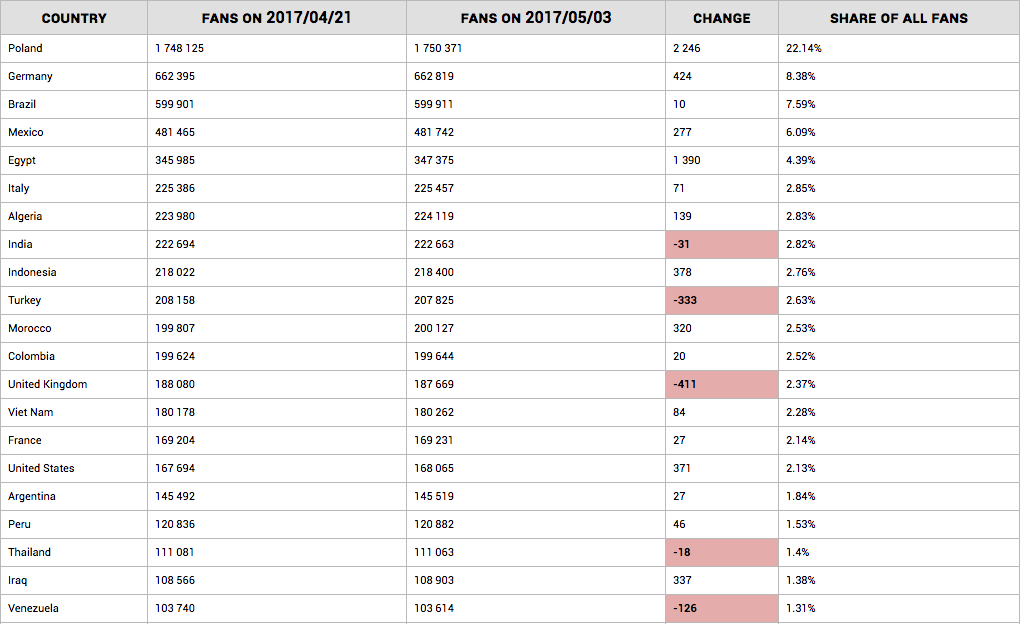 Szczegółowe dane pokazują, iż jest 21 krajów, z których pochodzi ponad 100 tys. fanów. Stanowią oni 84% wszystkich fanów.