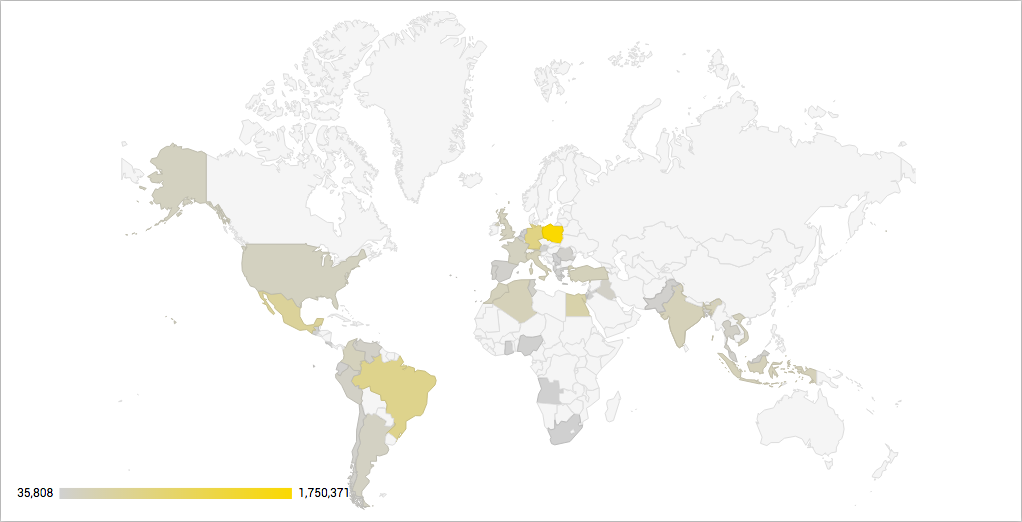 Światowa mapa fanów strony Roberta Lewandowskiego wygląda następująco (źródło: NapoleonCat, dane na dzień 03 maja 2017):
