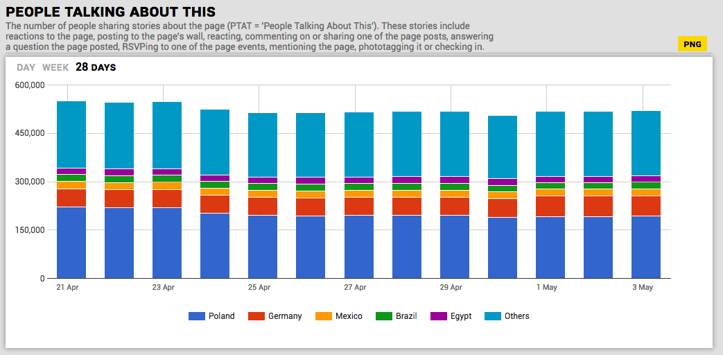 Rozkład geograficzny osób wchodzących w interakcję z treściami publikowanymi na stronie Roberta Lewandowskiego, czyli facebookowy PTAT (People Talking About This) wygląda podobnie.