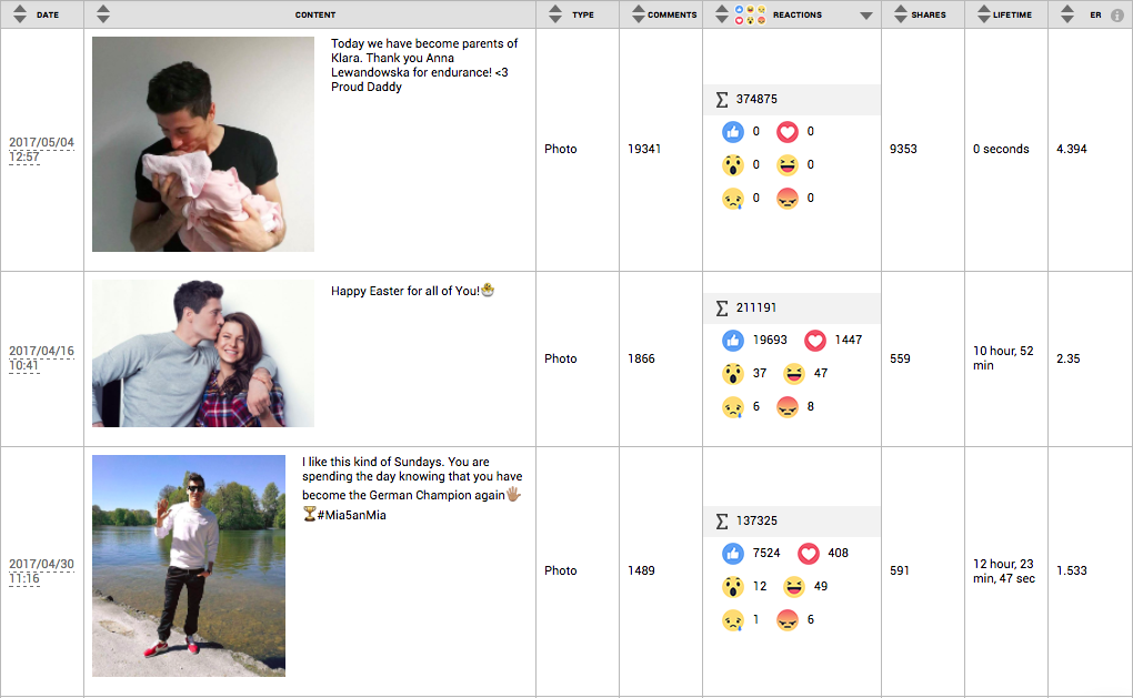 Przy szesnastu opublikowanych w tym czasie postach daje to wartość PLN 117 tys. na post. Oczywiście, nie każdy post uzyskuje tak samo wysokie zaangażowanie użytkowników, a najatrakcyjniejsze są te, które pokazują prywatne życie Roberta, co ilustruje poniższe zestawienie trzech najbardziej angażujących w ostatnich 30 dniach postów: