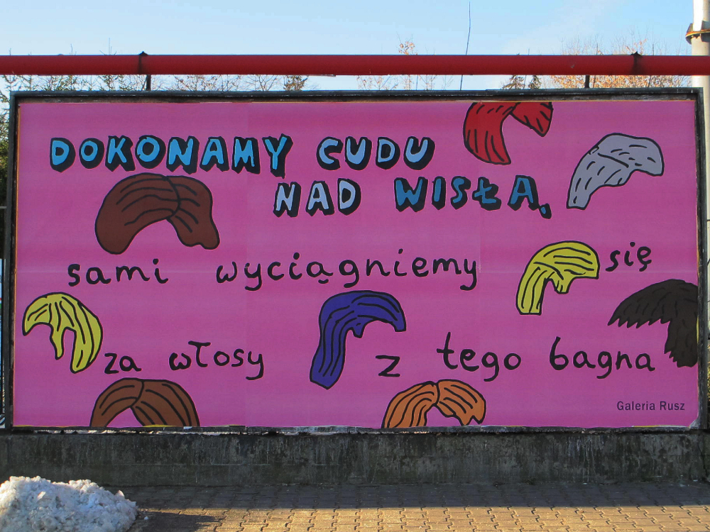 Praca pt. „Cud” do oglądania na bilbordzie warszawskiego oddziału Galerii Rusz. Bilbord usytuowany jest na skrzyżowaniu Czerniakowskiej i Łazienkowskiej 3.