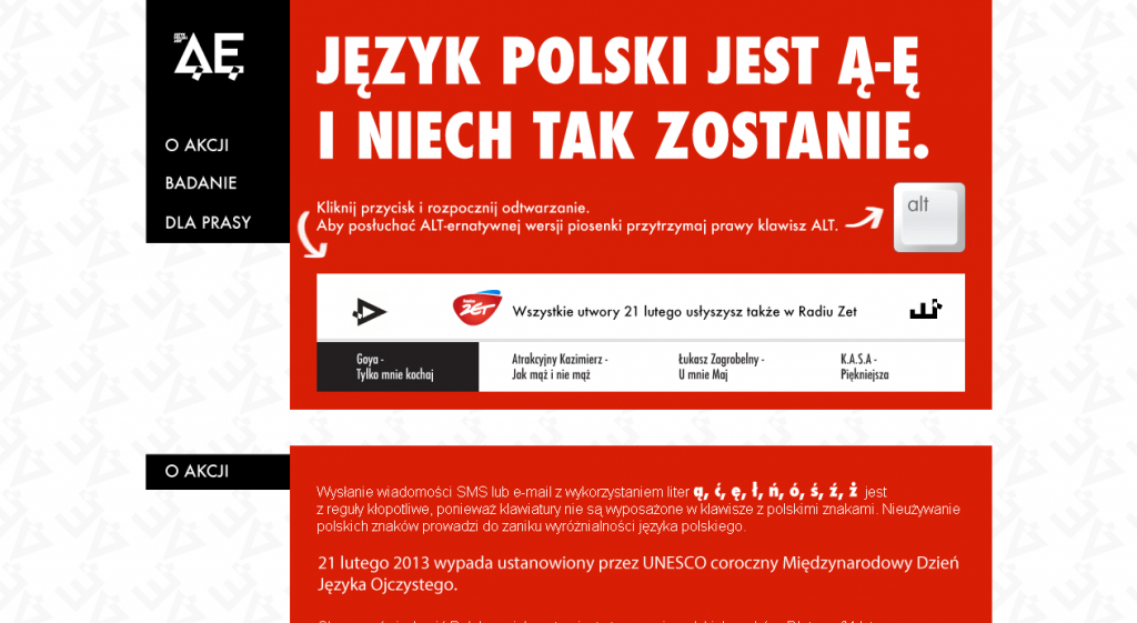 W ramach kampanii „Język polski jest ą-ę” 21 lutego – w dzień Międzynarodowego Dnia Języka Ojczystego – z polskich gazet, portali internetowych, stacji telewizyjnych i radiowych znikną polskie znaki. W radiach puszczane będą popularne piosenki polskich wykonawców, pozbawione klasycznej gramatyki. Krótkie spoty promujące akcję zostaną wyświetlone w warszawskim metrze.