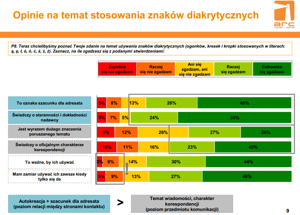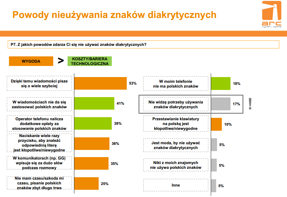 Z badania ARC Rynek i Opinia „Polacy a używanie znaków diakrytycznych” wynika, że aż 63% Polaków nie zawsze dba o poprawność językową swoich wypowiedzi ustnych, a co druga osoba nie przykłada wagi do poprawności swoich wypowiedzi pisemnych. Mimo że 64% Polaków jest zdania, że to co wyróżnia język polski od innych języków i jest najbardziej charakterystyczną cechą języka polskiego to znaki diakrytyczne, co piąta osoba ich nie używa, bo nie widzi takiej potrzeby. Aż 53% Polaków nie stosuje polskich znaków ze względów logistycznych, dzięki temu – jak twierdzą ankietowani – wiadomości pisze się o wiele szybciej.