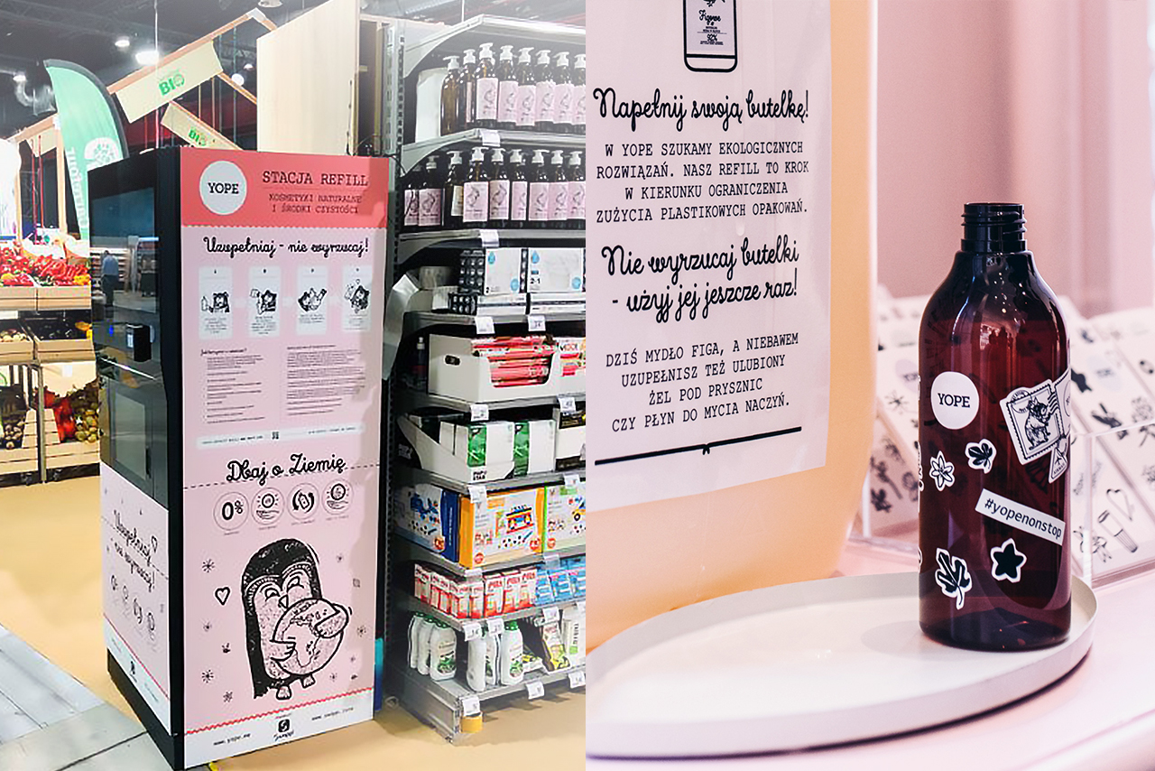 Jak już wspomnieliśmy, sklepy internetowe powinny zachęcać konsumentów do ponownego wykorzystywania opakowań lub zużytych produktów. Pierwszym krokiem może być informacja na stronie internetowej i oferta, która popchnie konsumenta do podjęcia bardziej świadomej (być może zupełnie nowej) decyzji zakupowej. Przy- kładem jest polski sklep z kosmetykami i środkami czystości Yope, który na swojej stronie umożliwia nie tylko wybranie standardowych produktów w plastikowych butelkach, ale także produktów uzupełniających (tzw. refill) w saszetkach z korkiem czy opakowaniach 3-litrowych typu bag-in-box czyli opakowaniach o znacznie mniejszej zawartości plastiku. Takim działaniem marka zachęca do tego, aby tylko raz kupować „pełnowymiarowy” produkt w butelce, a następnie jedynie dolewać do niej np. mydło z saszetek. Co więcej, marka wykracza swoimi działaniami poza obszar internetu i wyposaża sklepy… w innowacyjne stacje refill, dzięki którym całkowicie można zrezygnować z kupowania produktu w plastiku.