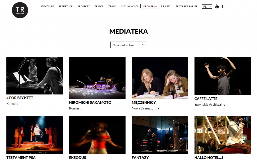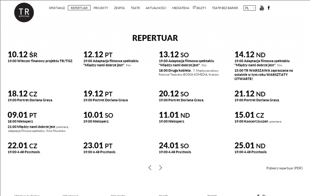 Strona zawiera opisy spektakli aktualnych i archiwalnych, prezentuje repertuar, oraz bieżące informacje o projektach dodatkowych prowadzonych przez teatr – koncertach, sztukach dokumentalnych, koncertach, które znajdują dla siebie miejsce na scenie przy Marszałkowskiej. W zakładce Mediateka znaleźć można również wiele materiałów multimedialnych opowiadających o historii i działalności teatru oraz życiu ludzi z nim związanych. W osobnym miejscu zaprezentowany został cały zespół. Całość tworzy spójny i charakterystyczny obraz TR Warszawa w sieci.