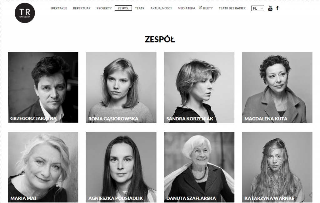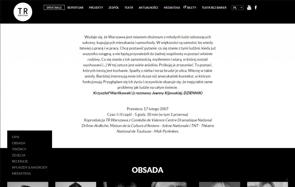 Nową stronę stworzono tak, aby pokazać, że TR Warszawa to nie tylko scena, ale także szereg działań okołoteatralnych. Strona prezentuje teatr przez pryzmat działań, realizowanych w tym miejscu, bo TR Warszawa to właściwie instytucja kulturalna, eksperymentująca i szukająca nowych środków wypowiedzi. Dlatego też uznano, że działania prowadzone przez teatr nie wymagają wymyślania charakterystycznej i oryginalnej oprawy w sieci, a jedynie sprawnego wydobycia na światło dzienne najważniejszych treści opowiadających o codziennej działalności tak, by podkreśli projekty graficzne, z których słynie TR Warszawa. Plakaty i zdjęcia ze spektakli mają mocną, zapadającą w pamięć formę i tworzą charakterystyczny, artystyczny klimat.