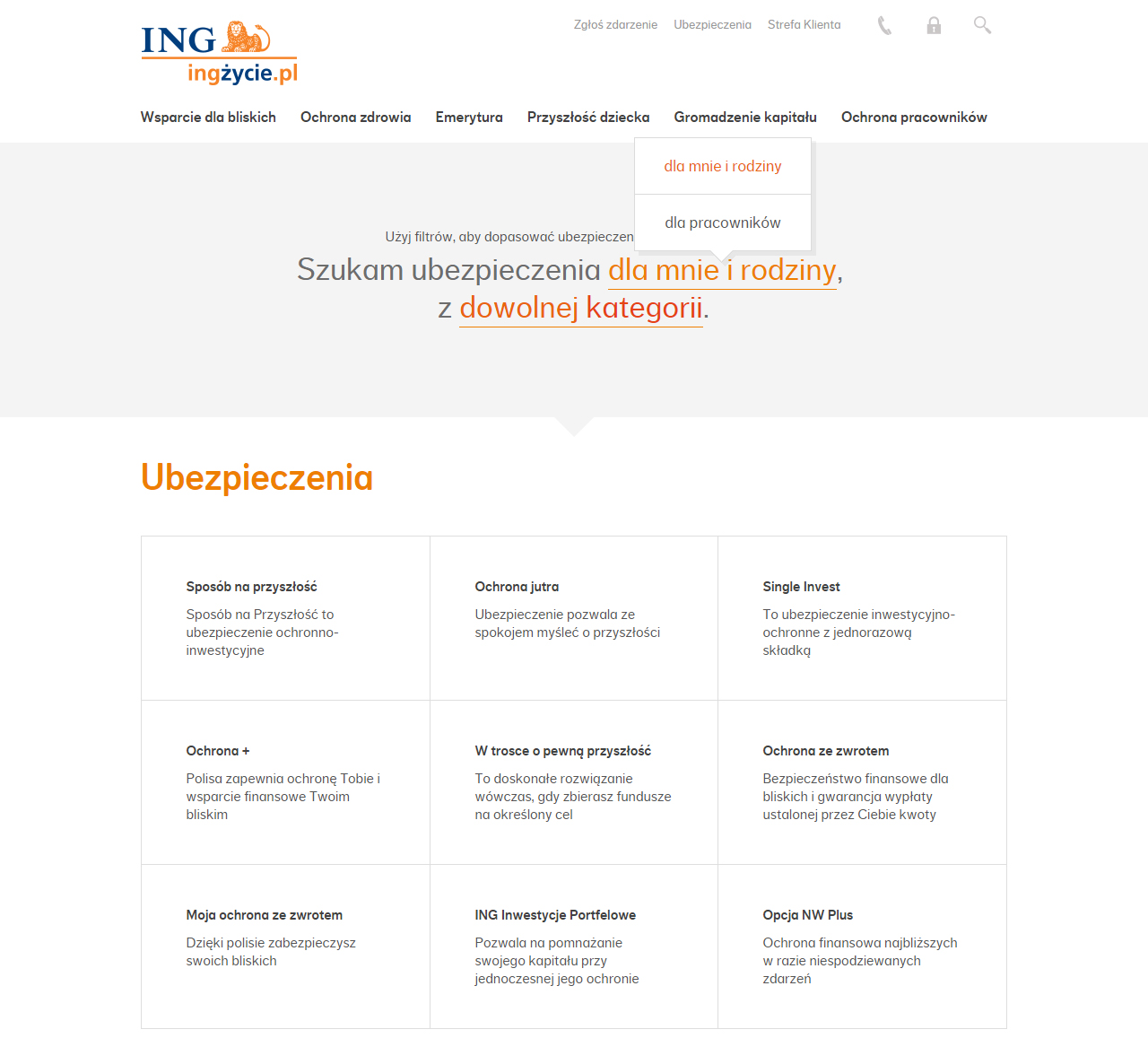Na tym etapie głównym celem przeprowadzonych zmian jest uświadomienie klientom potrzeby ubezpieczenia – tego dotyczą główne działy w serwisie. Postawiono na wyeksponowanie informacji o tym dlaczego ubezpieczenie na życie jest ważne i w jakich sytuacjach jest przydatne ale bez zbędnego zarzucania odbiorców treścią. Dla tych, którzy wolą porozmawiać z agentem, zaprezentowano informacje w sposób skrótowy i umożliwiono bezpośredni kontakt z agentem lub oddziałem. Natomiast informacje szczegółowe są dostępne tylko dla tych, którzy lubią wiedzieć wszystko na temat produktu zanim porozmawiają ze specjalistą. Odczuwalne zmiany wprowadzono również do sekcji dla stałych klientów, tak, by ważne dla nich informacje były łatwo dostępne i podane w sposób przystępny i atrakcyjny, by podkreślić, że ING jest to firma, która zna ich potrzeby i najlepiej doradzi jak zabezpieczyć przyszłość.