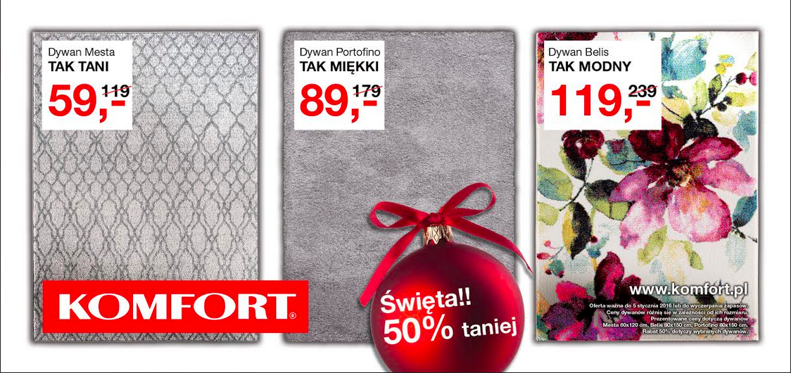 „Każda pani domu chce, aby w Święta jej dom wyglądał wyjątkowo i odświętnie, a nowy dywan doskonale odmieni wnętrze. W ramach akcji szczególnie promujemy trzy dywany: puszysty shaggy Portofino, orientalny Mesta o wzorze inspirowanym modną marokańską koniczyną oraz bardzo efektowny Belis ozdobiony pięknym kwiatowym wzorem. Każdy z nich adresowany jest do innej grupy konsumentek”. – mówi Anna Heimberger, Dyrektor Marketingu Sklepy Komfort S.A.