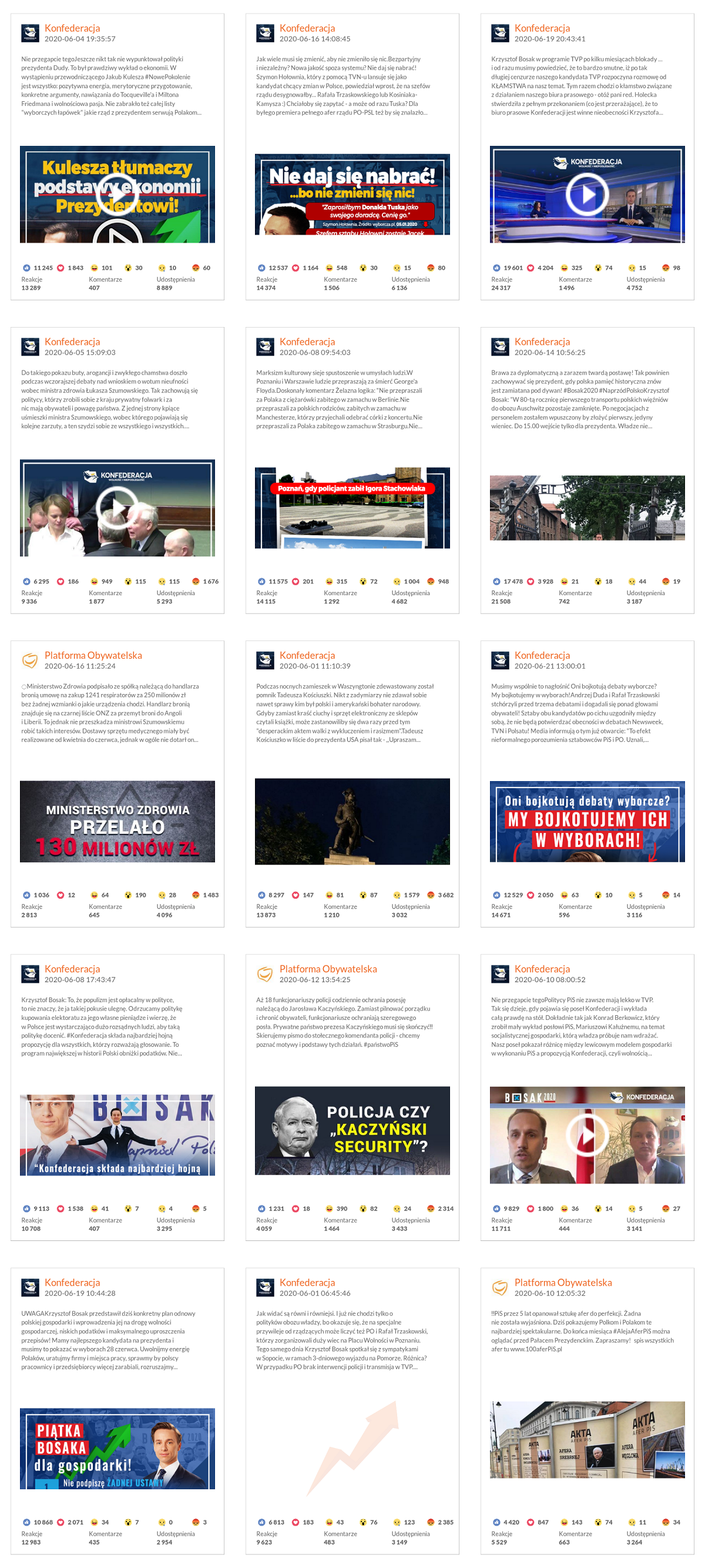 5. Jeśli chodzi o profile partii politycznych – największym zaangażowaniem cieszy się profil Konfederacji (ostatnie 3 tyg.). Z kolei, najwięcej komentarzy o sentymencie negatywnym w ciągu ostatniego weekendu opublikowano na profilu PO – ponad 60% wszystkich komentarzy.