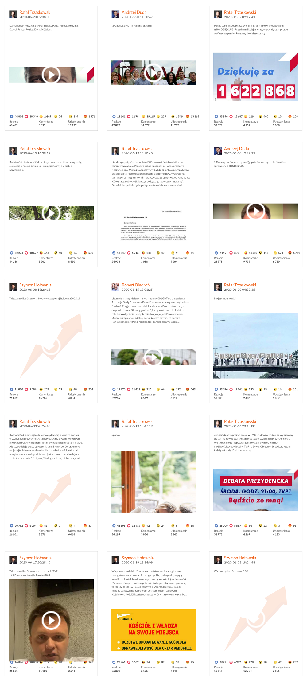 2. Najbardziej angażujące posty publikowano na profilu Rafała Trzaskowskiego. Największy spadek zaangażowania odnotowano na profilu Szymona Hołowni.