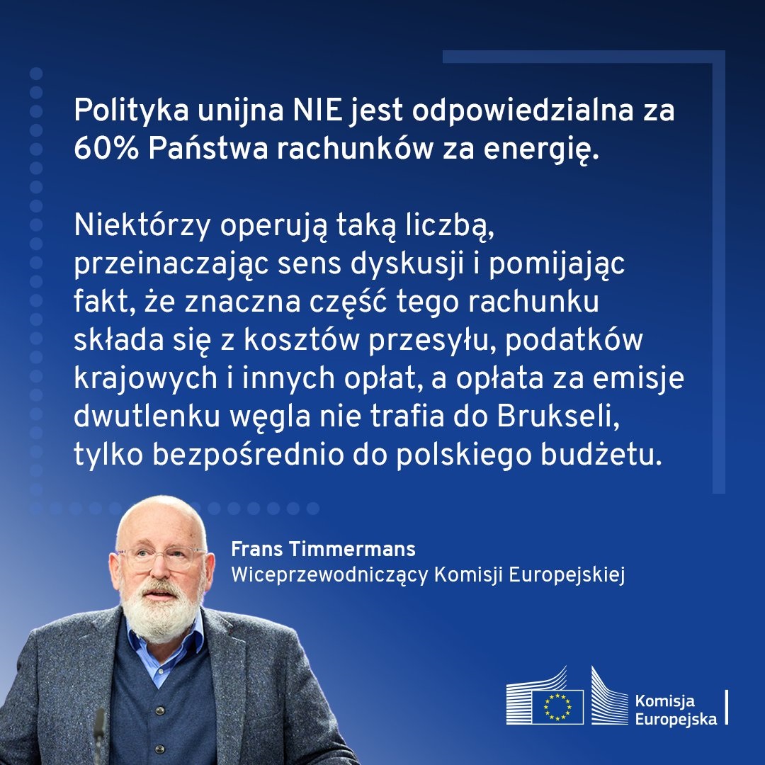 Niestety, w Polsce transformacja energetyczna przebiega dużo wolniej niż w sąsiednich państwach. Od 2005 r. emisje zmniejszyły się jedynie o 8%. W tym samym czasie Rumunia zmniejszyła te emisje o 27, Słowacja o 25, a Czesi o 21%. To właśnie odwlekane decyzje są powodem, dla którego cena emisji dwutlenku węgla stanowi około 20% (nie 60%) rachunków za energię w Polsce – i to dużo więcej niż średnia w innych krajach UE – tłumaczy wiceszef KE.