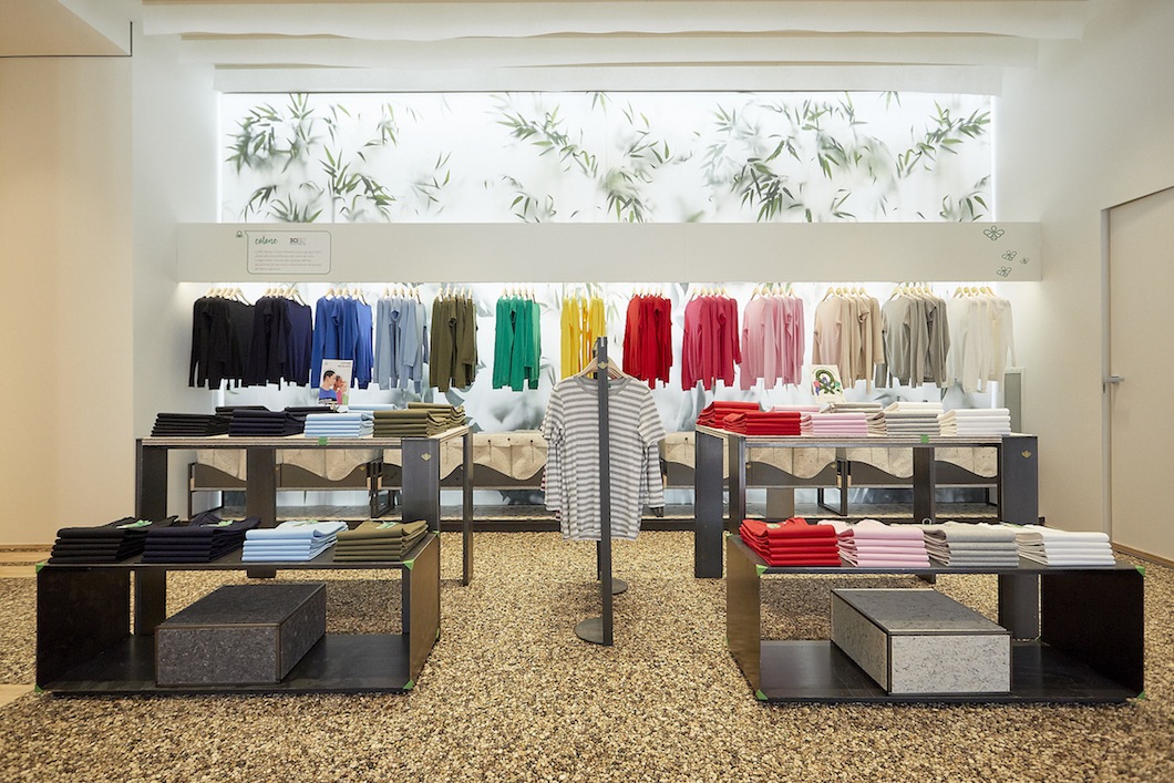 Wnętrze sklepu Benettona zaprojektowane jest bowiem z materiałów pochodzących z odzysku – podłogę zbudowano z powalonych huraganem w 2018 roku drzew z regionu Veneto, a ściany sklepu pomalowano farbą mineralną o naturalnych właściwościach antybakteryjnych i grzybobójczych, która neutralizuje zanieczyszczenia powietrza. Dodatkowo wyposażenie sklepu wyprodukowano z resztek materiałów z procesu produkcji tekstyliów. Do produkcji mebli wykorzystano zużyte guziki zmieszane z żywicą, z resztek wełny wyprodukowano dekoracje i zasłony w przebieralniach. Półki i manekiny stworzono z tzw. Rossino – masy powstałej z zmiksowanych włókien tkanin.