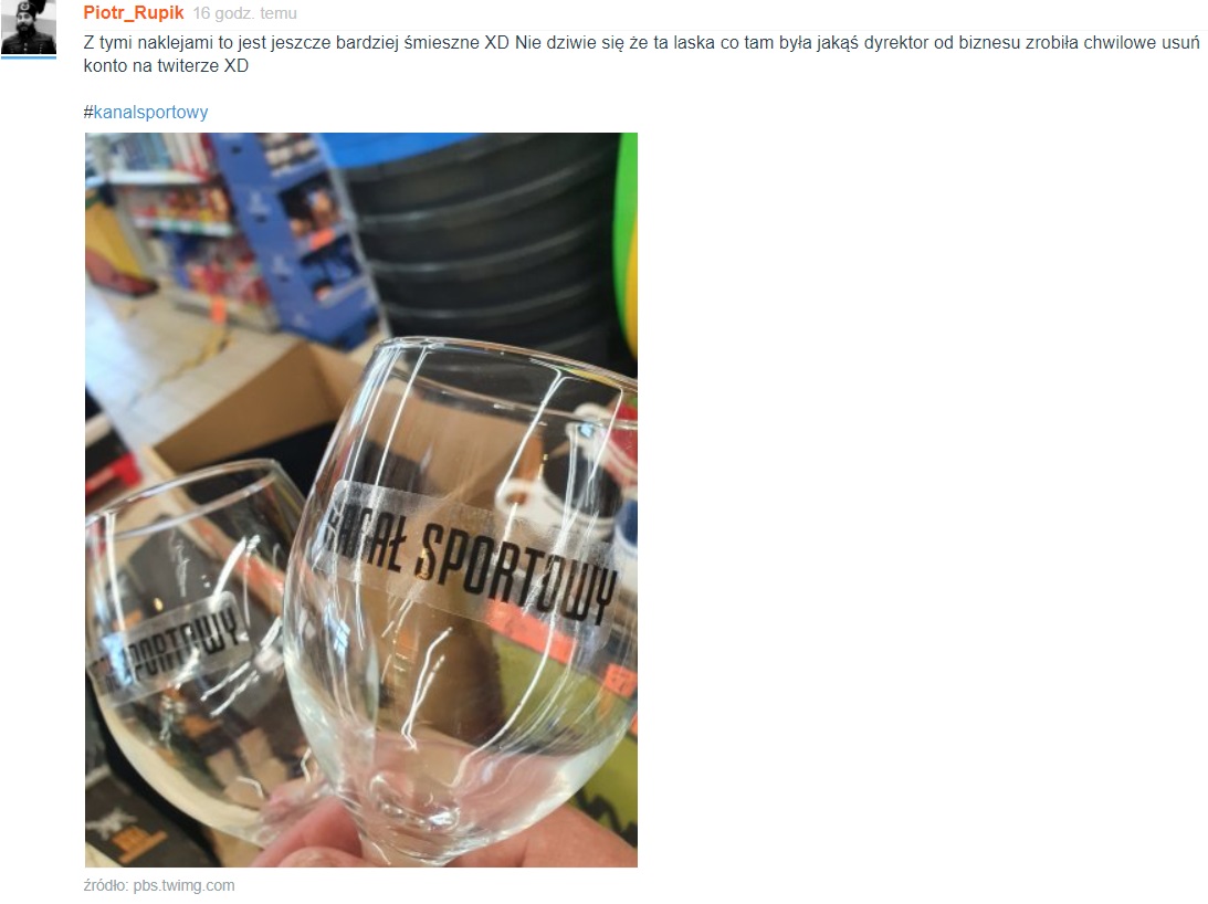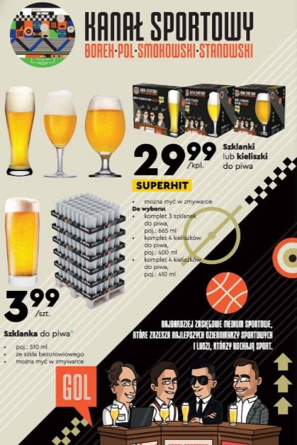 Natomiast od dziś w sklepach sieci Biedronka można kupić specjalne szklanki od Kanału Sportowego – komplety są pakowane w efektowne kartony z logo Kanału oraz kreskówkowymi wizerunkami jego właścicieli i głównych twórców: Mateusza Borka, Krzysztofa Stanowskiego, Tomasza Smokowskiego i Michała Pola. Jak informowano na kanałach social media, logo Kanału znalazło się również na samym szkle. Nic zatem dziwnego, że odbiorcy takiego komunikatu oczekiwali eleganckich szklanek, które będą fajnym gadżetem dla fanów youtuberów.